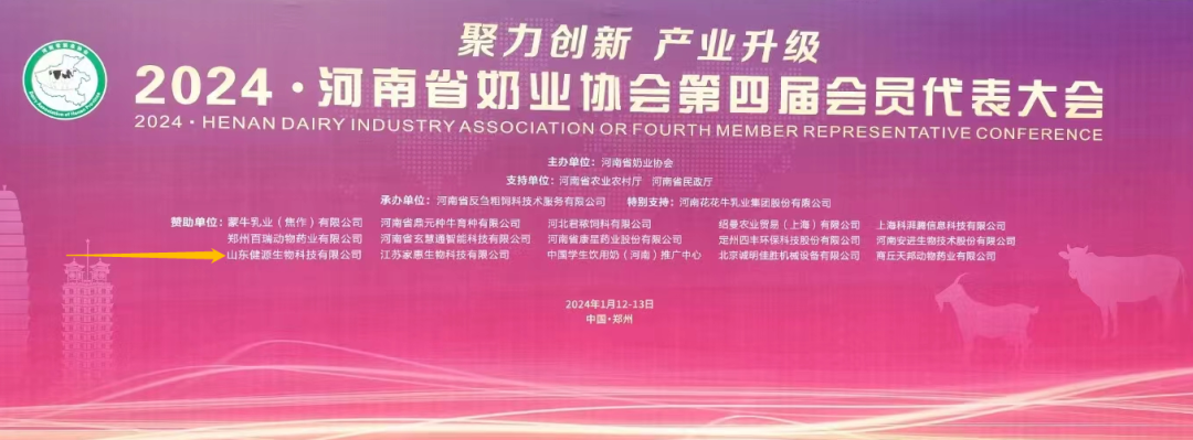 2024年1月12-13日,由河南省奶業(yè)協(xié)會(huì )主辦、河南省農業(yè)農村廳、河南省民政廳支持的2024河南奶業(yè)協(xié)會(huì )第四屆會(huì )員代表大會(huì )在鄭州舉行。農業(yè)農村部相關(guān)業(yè)務(wù)部門(mén)領(lǐng)導、河南省農業(yè)農村廳奶業(yè)管理處相關(guān)領(lǐng)導、行業(yè)協(xié)會(huì )領(lǐng)導、國內知名行業(yè)專(zhuān)家、奶業(yè)相關(guān)產(chǎn)業(yè)代表200余人參加此次大會(huì )。山東健源生物科技有限公司作為贊助單位參加此次大會(huì )。