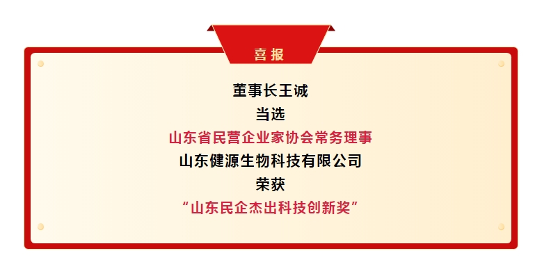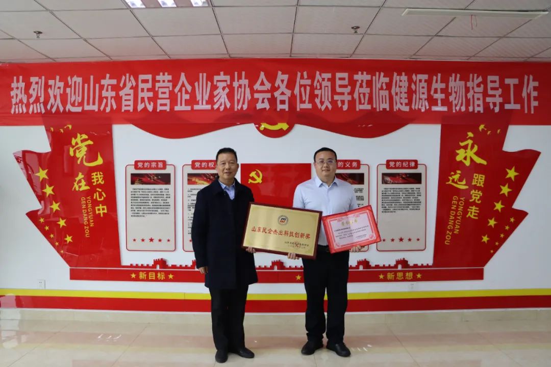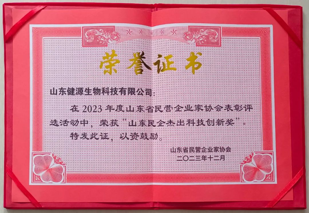 在科技創(chuàng )新的征途上,健源生物再創(chuàng )佳績(jì),榮獲山東省民營(yíng)企業(yè)家協(xié)會(huì )“山東民企杰出科技創(chuàng )新獎”。