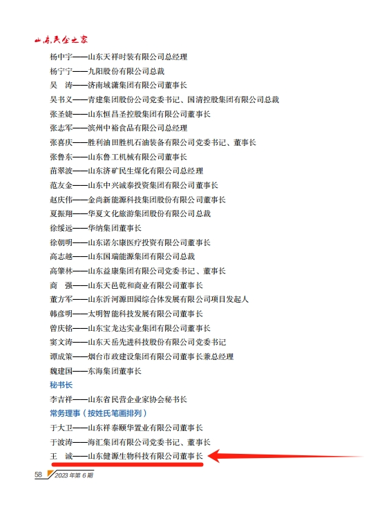 近日,在2023年度山東省民營(yíng)企業(yè)家協(xié)會(huì )表彰評選活動(dòng)中,經(jīng)山東省民營(yíng)企業(yè)家協(xié)會(huì )三屆十六次會(huì )長(cháng)會(huì )議研究,報請協(xié)會(huì )三屆五次會(huì )員代表大會(huì )審議,決定增補山東健源生物科技有限公司董事長(cháng)王誠為山東省民營(yíng)企業(yè)家協(xié)會(huì )第三屆理事會(huì )常務(wù)理事。