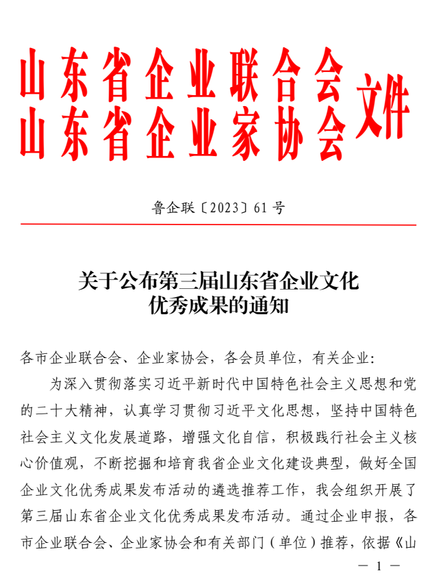 本次企業(yè)文化成果評選活動(dòng)由山東省企業(yè)聯(lián)合會(huì )、山東省企業(yè)家協(xié)會(huì )主辦,為深入貫徹落實(shí)習近平新時(shí)代中國特色社會(huì )主義思想和黨的二十大精神,認真學(xué)習貫徹習近平文化思想,堅持中國特色社會(huì )主義文化發(fā)展道路,增強文化自信,積極踐行社會(huì )主義核心價(jià)值觀(guān),不斷挖掘和培育我省企業(yè)文化建設典型,做好全國企業(yè)文化優(yōu)秀成果發(fā)布活動(dòng)的遴選推薦工作。通過(guò)推出一批把握文化方向、時(shí)代脈搏的企業(yè)文化優(yōu)秀成果,堅定廣大企業(yè)以文化強企之路,充分發(fā)揮企業(yè)文化在企業(yè)發(fā)展中的作用。