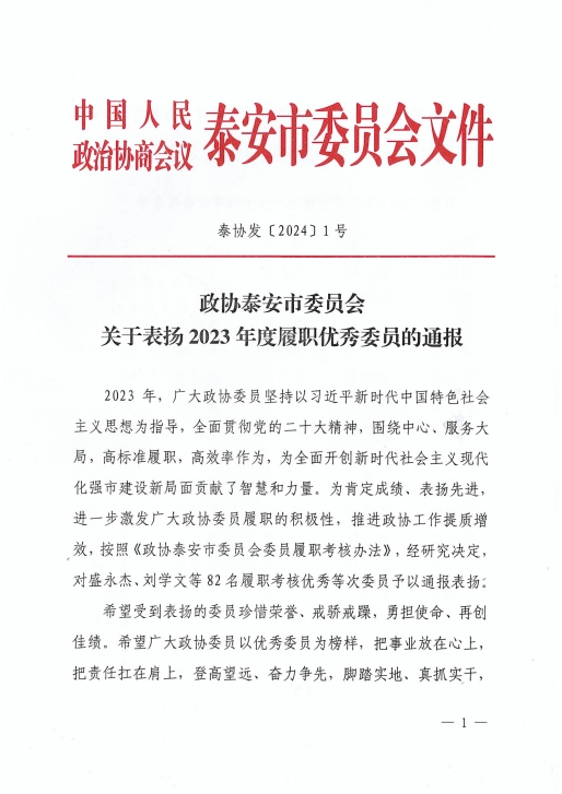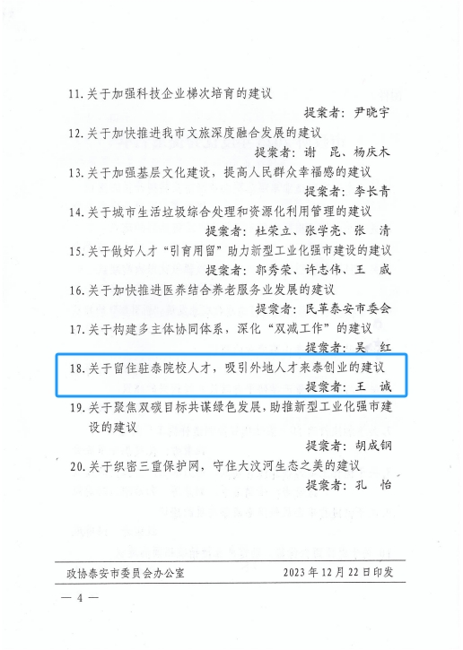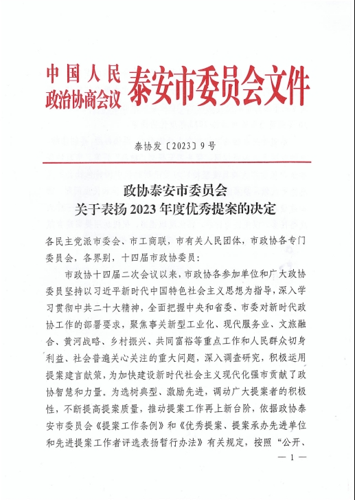 在會(huì )上,政協(xié)泰安市委員會(huì )發(fā)布了關(guān)于表?yè)P2023年度優(yōu)秀提案的決定,王誠董事長(cháng)《關(guān)于留住駐泰院校人才,吸引外地人才來(lái)泰創(chuàng )業(yè)的建議》被選為優(yōu)秀提案。