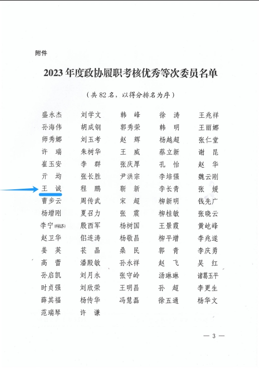 2023年,廣大政協(xié)委員堅持以習近平新時(shí)代中國特色社會(huì )主義思想為指導,全面貫徹黨的二十大精神,圍繞中心、服務(wù)大局、高標準履職、高效率作為,為全面開(kāi)創(chuàng )新時(shí)代社會(huì )主義現代化強市建設新局面貢獻了智慧和力量。為表?yè)P先進(jìn),會(huì )上公布了2023年度政協(xié)履職考核優(yōu)秀等次委員名單,董事長(cháng)王誠光榮上榜!