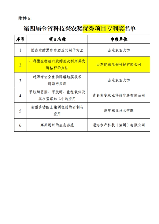 山東健源生物科技有限公司申報的《一種微生物秸稈發(fā)酵劑及其發(fā)酵秸稈的方法》項目獲得山東省農業(yè)科技轉化促進(jìn)會(huì )科技興農獎優(yōu)秀項目獎專(zhuān)利獎。健源生物旗下子公司山東寵言生物科技有限公司申報的《寵物清潔健康養殖關(guān)鍵技術(shù)研發(fā)與應用》項目獲得山東省農業(yè)科技促進(jìn)會(huì )科技興農獎優(yōu)秀項目獎一等獎,董事長(cháng)王誠為兩個(gè)項目的第一完成人。