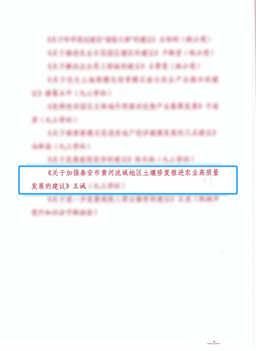 發(fā)布時(shí)間:[2024-7-9 17:52:5] 瀏覽量:3339次會(huì )上公布了《關(guān)于2023年度黨外人士建言獻策工作先進(jìn)典型的通報》,王誠董事長(cháng)被評為2023年度黨外人士建言獻策“建言先鋒”,撰寫(xiě)的《關(guān)于加強泰安市黃河流域地區土壤修復推進(jìn)農業(yè)高質(zhì)量發(fā)展的建議》被評為2023年度黨外人士建言獻策“金點(diǎn)子”。