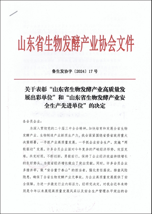 近日,山東省生物發(fā)酵產(chǎn)業(yè)協(xié)會(huì )發(fā)布關(guān)于表彰“山東省生物發(fā)酵產(chǎn)業(yè)高質(zhì)量發(fā)展出彩單位”和“山東省生物發(fā)酵產(chǎn)業(yè)安全生產(chǎn)先進(jìn)單位”的決定,山東健源生物科技有限公司榮獲“山東省生物發(fā)酵產(chǎn)業(yè)高質(zhì)量發(fā)展出彩單位”稱(chēng)號。