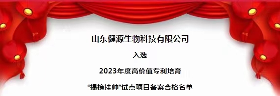 山東健源生物科技有限公司 入選 2023年度高價(jià)值專(zhuān)利培育 “揭榜掛帥”試點(diǎn)項目備案合格名單 日前...