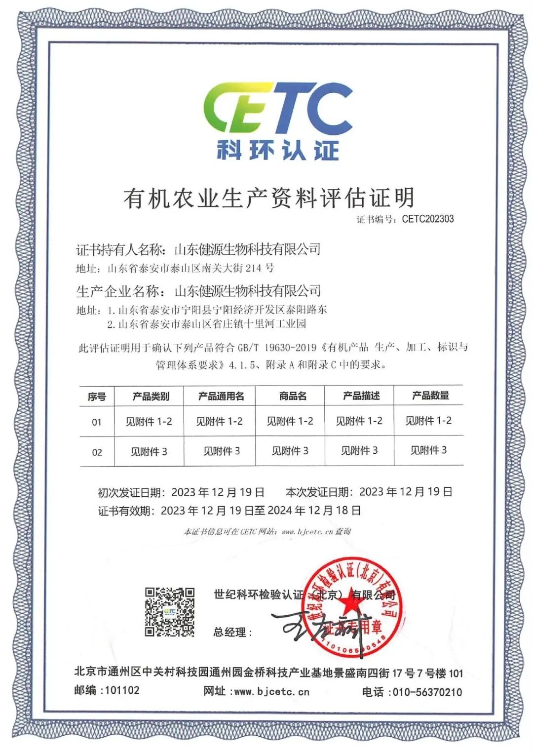2024-1-3 健源生物高活性生物系列產(chǎn)品通過(guò)“有機農業(yè)生產(chǎn)資料評估證明”認證