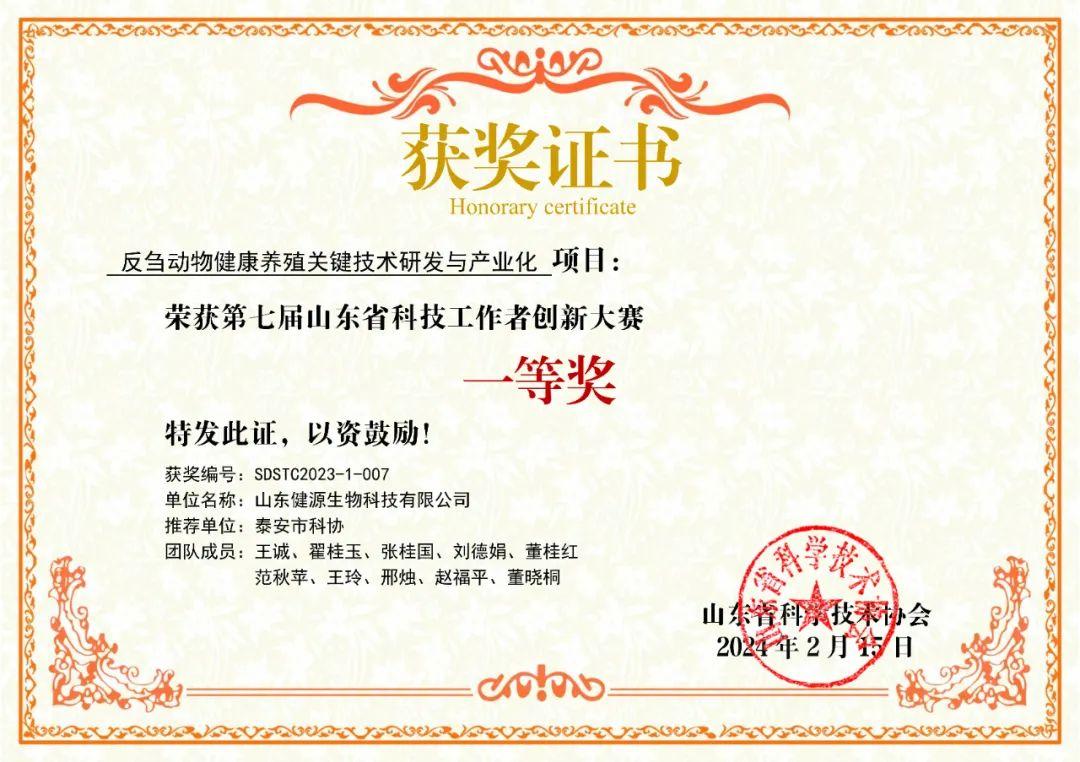 由山東健源生物科技有限公司申報,泰安市科協(xié)推薦的《反芻動(dòng)物健康養殖關(guān)鍵技術(shù)研發(fā)與產(chǎn)業(yè)化》項目榮獲第七屆山東省科技工作者創(chuàng )新大賽一等獎。