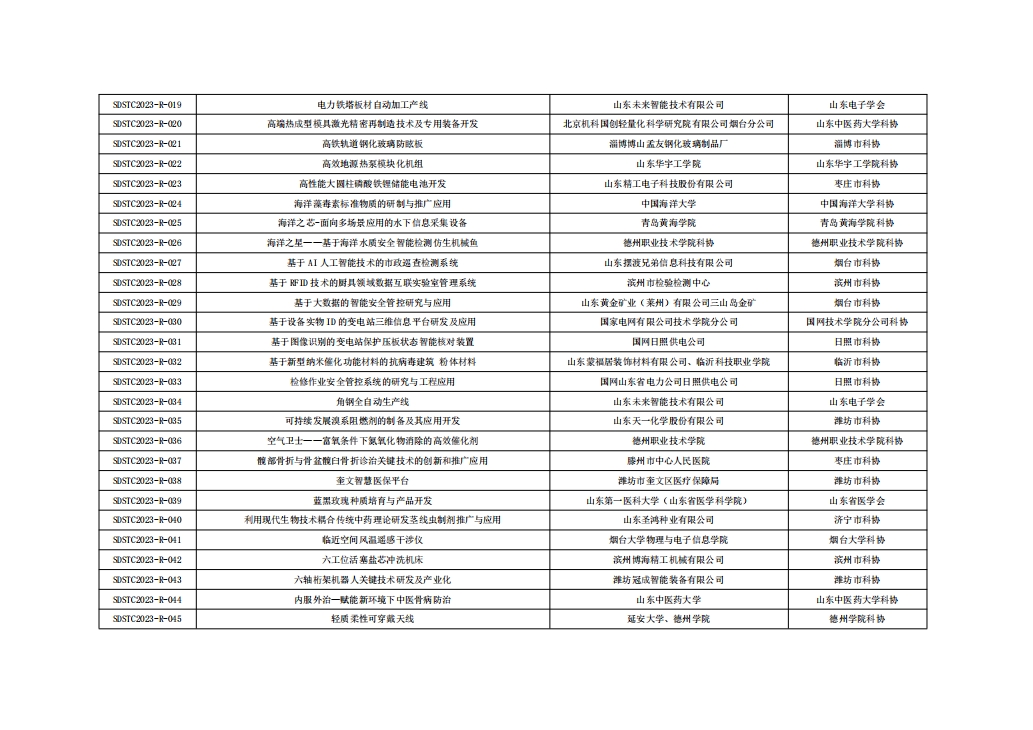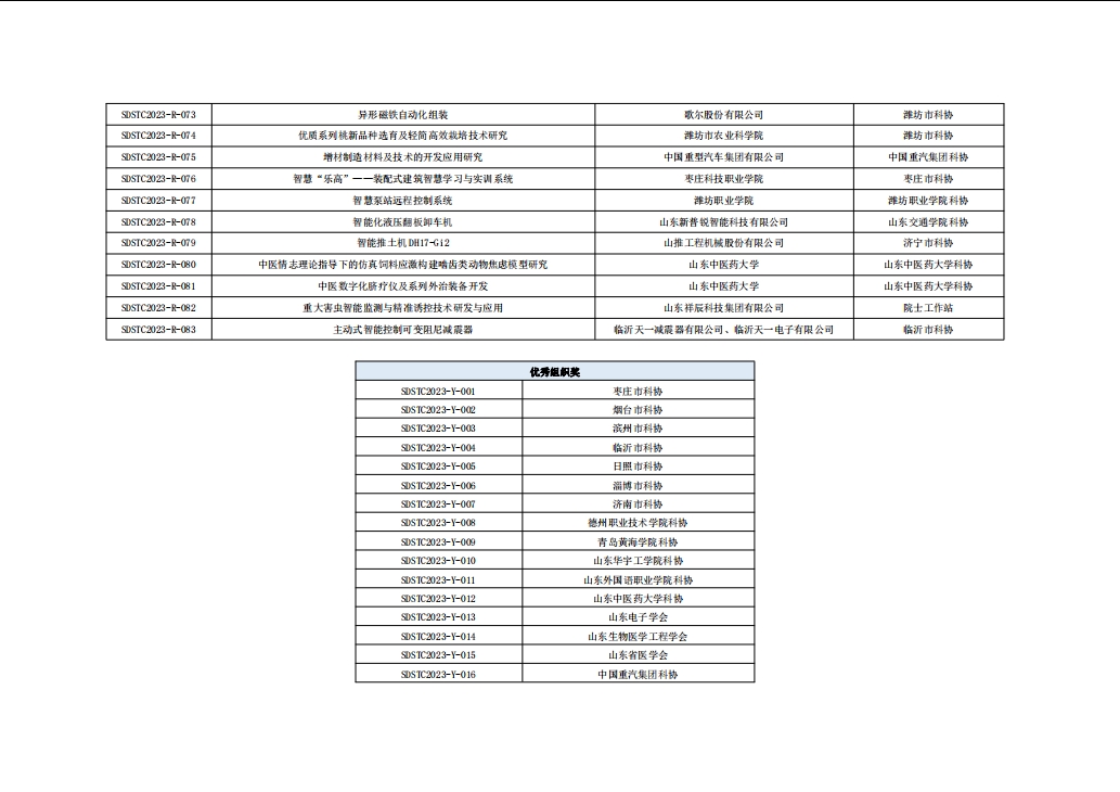 由山東省科協(xié)主辦,山東電子學(xué)會(huì )、濟南市科協(xié)、浪潮科創(chuàng )中心承辦的山東省第七屆科技工作者創(chuàng )新大賽于2023年12月29日完成決賽。年度大賽由各市科協(xié)、省級學(xué)會(huì )、高?茀f(xié)、院士工作站等征集遴選、擇優(yōu)推薦的334項參賽項目,經(jīng)專(zhuān)家初審、復審、現場(chǎng)決賽、公示等環(huán)節,共評出一等獎21項,二等獎42項,三等獎53項,專(zhuān)項獎12項,入圍獎83項,優(yōu)秀組織獎16項。