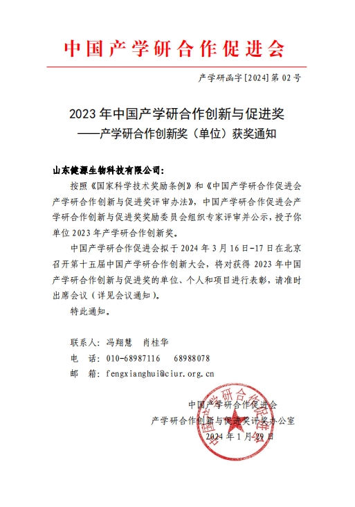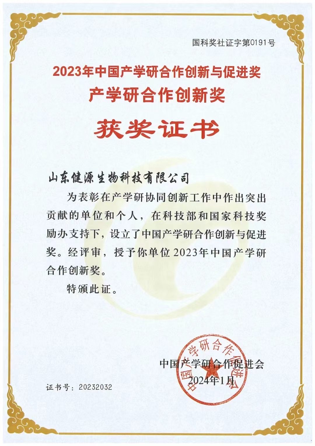 大會(huì )表彰了2023年在產(chǎn)學(xué)研協(xié)同創(chuàng )新工作中做出突出貢獻的單位和個(gè)人。山東健源生物科技有限公司被中國產(chǎn)學(xué)研合作促進(jìn)會(huì )授予2023年中國產(chǎn)學(xué)研合作創(chuàng )新獎。
