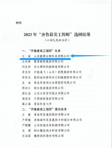 發(fā)布時(shí)間:[2024-7-5 15:51:56] 瀏覽量:3127次近日,山東省工程師協(xié)會(huì )下發(fā)關(guān)于授予2023年度“齊魯最美工程師”榮譽(yù)稱(chēng)號的通報,山東健源生物科技有限公司董事長(cháng)王誠被授予2023年度“齊魯最美工程師”榮譽(yù)稱(chēng)號。